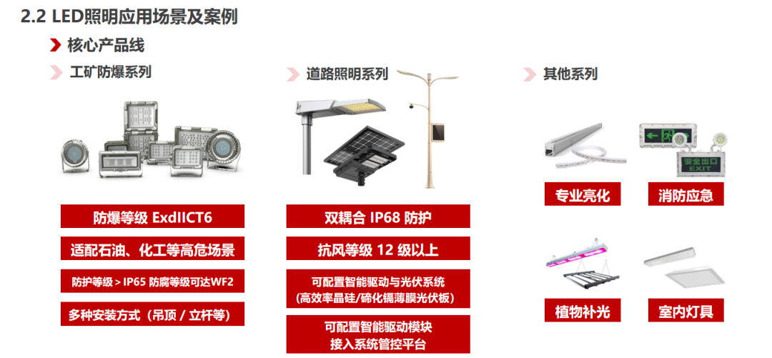 LED照明应用核心产品包括工矿/防爆灯具、道路照明灯具、工程亮化灯具、植物补光灯具及其他室内各种工业照明灯具。根据不同应用场景,工矿灯具产品采用LED光源平均寿命超10万小时,电源具备短路、过压保护;铝型材/一体化压铸铝外壳,表面经阳极氧化处理,防腐等级达WF2,防护等级IP66,可抵御潮湿、腐蚀等恶劣环境,适配高温、高粉尘场景。模组化镂空/全结构高效对流式散热设计,高效降低灯体温度;配备高精度光学透镜,可按需定制,提升作业面照度均匀性。支持U型架防滑防震角度调节,适配座式、侧壁、吸顶等多种安装方式,单工具即可完成角度调整,布线简单便捷。同时,可配置物联网智慧照明系统等先进技术,实现了工业矿山、桥梁道路港口、楼宇亮化、设施农业温室及室内办公场馆等领域的照明长期稳定可靠、智慧管控。