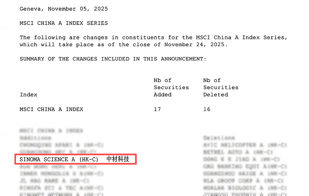 近期,国际指数编制公司MSCI最新公布的11月指数审核变更结果正式生效,中材科技股份有限公司(简称“中材科技”)被纳入MSCI中国指数,标志着公司的投资价值与开展潜力取得全球资本市场的认可,也为公司未来开展注入强劲动力。