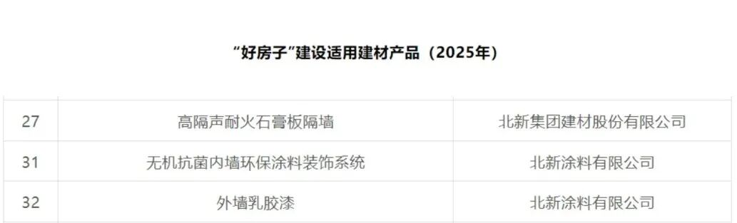近期,住房和城乡建设部科技与产业化开展中心正式公示“好房子”建设适用建材产品(2025年)首批名单,经严格审查,北新建材高隔声耐火石膏板隔墙、北新涂料无机抗菌内墙环保涂料装饰系统、北新涂料卓彩外墙涂料系统3款产品成功入选,成为“好房子”建设的优选建材伙伴。