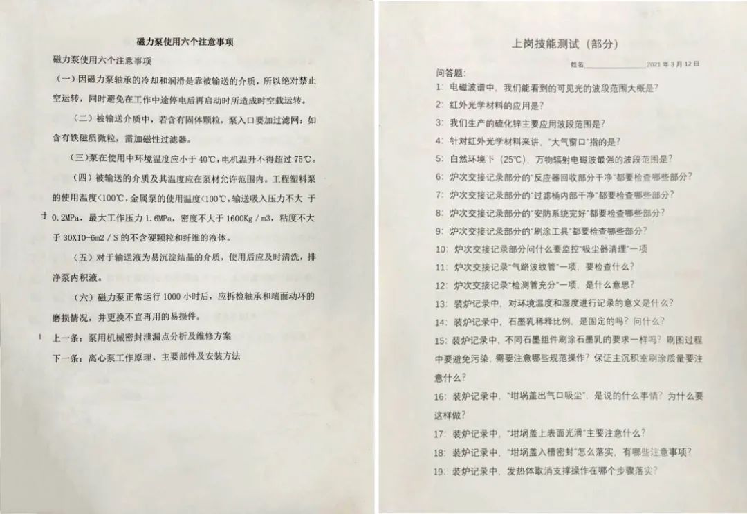 自2020年6月1日设备整体搬迁落地济南章丘中小园17号车间,张福昌博士就开始带领各位员工,用时2个月完全稳定恢复了装备,并同步招收新员工进行上岗培训工作。到2021年5月底,先后完成超过50次的上岗培训工作。多数上岗培训工作都是在晚六点到十点的非工作时间,多数时候是线下,即使张博士出差,也会有线上培训。培训内容包括安全、生产、工艺等多个方面,既有贴近现实操作的培训,如“学习开炉记录操作的每一个细节部分”;也有物理和材料的基础知识讲解,比如“电磁波、大气窗口、红外光学波等”,以便让员工“知其然,也知其所以然,”从而做到岗位员工既具有“专”的特点,也具备“全”的能力,实现了岗位专一和员工互补的双重构架。张博士不仅对各类知识点讲解细致,而且对各种操作中可能发生的不良问题追根溯源,提前分析预判解决,并一一讲解原因。