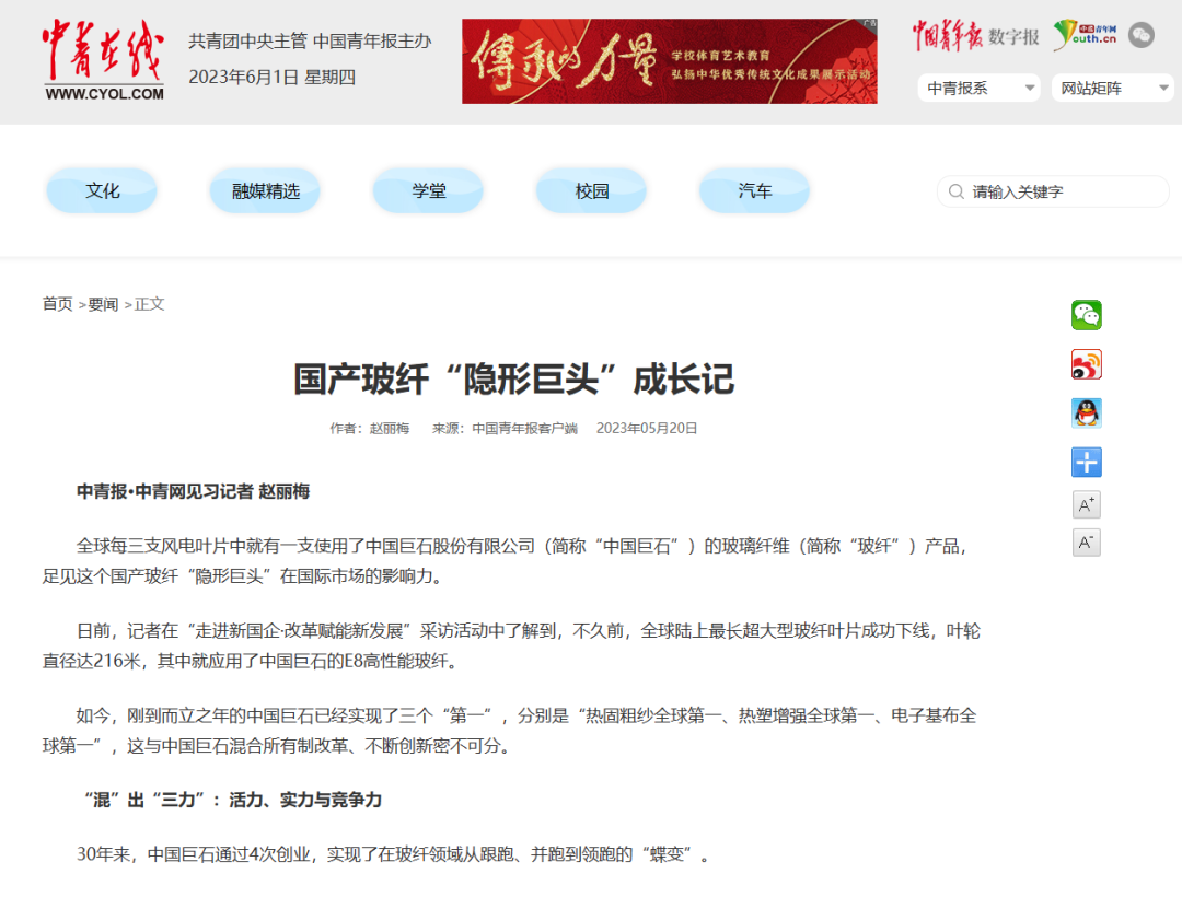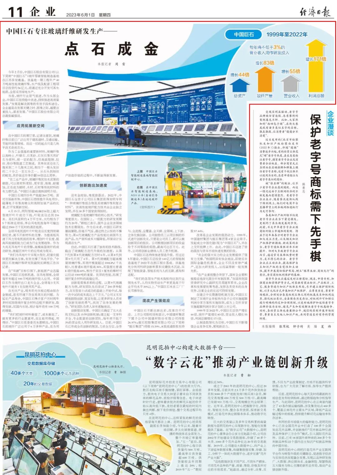 释放改革活力 激发澎湃动能 ——“走进新国企·改革赋能新开展”大型融媒采访活动侧记 (扫码阅读原文) 1999年至2022年,中国巨石的总资产增长了近44倍,玻纤产量增长了83倍,营业收入增长了55倍,利润总额增长了171倍,合计国有资产保值增值率达217倍。国有资本与民营资本的有机融合,带领中国巨石进入了一个更高更大的平台,也为其创造了无限可能。 经济日报 中国巨石专注玻璃纤维研发生产——点石成金 (扫码阅读原文) 作为工业强基的重要新材料,玻璃纤维以高岭土、叶腊石、石英砂、石灰石等天然矿石为原料,按一定的配方,经高温熔制、拉丝、络纱等数道工艺制成。其单丝直径在几微米到二十几微米之间,相当于一根头发丝的二十分之一至五分之一。从石头到细丝的蜕变,其价值远非身价翻10倍这么简单。 科技日报 智能制造 助力中国玻纤走向全球 ——中国巨石智能制造基地调研采访见闻 (扫码阅读原文) 报道生动描绘了巨石智能制造基地的生产忙碌图景,强调中国巨石在K8凯发国际集团给予的充分信任下,抓住先机,牢牢把握新一轮科技革命和产业变革的大势,向数字化、智能化方向优化升级,在智能制造方面取得优异成绩。 中国青年报 国产玻纤“隐形巨头”成长记 (扫码阅读原文) 中国巨石智能制造基地1000多亩的土地上,一年可以产出 60 万吨粗纱、22 万吨细纱和8亿米电子布,电子布的长度可绕地球两圈。中国巨石还将“未来工厂”建设扩大到了外部,促进产业上下游协同开展。如今,中国巨石的智能制造等先进玻纤生产技术已从桐乡总部推广至成都、九江、埃及苏伊士以及美国南卡罗来纳州。中国巨石还打通了生产制造与企业经营的数据链,顺利获得高标准建设行业工业互联网平台,实现产品生命周期、生产经营的全领域的数字化管理。 工人日报 这些年,国企改革带来新变化 (扫码阅读原文) 从1993年创建,建起第一座中国人自己设计的玻璃纤维池窑,到打破国外长期技术垄断,实现全球市场占有率四分之一,巨石一路弯道超车,成为世界规模最大的玻璃纤维制造商。如何创造这份奇迹?中国巨石给出了答案。 中国证券报 实探中国巨石“未来工厂”建设 (扫码阅读原文) 中国巨石有助于‘数字技术+制造技术’融合开展,深化‘产业大脑+未来工厂’建设,引领玻纤工业数字化变革,现在已实现“热固粗纱、热塑增强、电子基布”三个“全球第一”目标,为世界玻纤工业开展树立了一座新标杆。2023年又开启了打造全球首个玻纤零碳智能制造基地的新征程。 “现代新国企”是怎样炼成的 (扫码阅读原文) 在中国巨石未来工厂里,每天生产的玻纤纱能绕地球450圈,工厂自动化率超98.5%,大大提升人均生产效率,远超行业平均水平。 第一财经 混改赋能、重组质变: 三年改革为国企带来新变化 (扫码阅读原文) K8凯发国际持续探索差异化管控新模式,在允许范围内给予中国巨石最大的经营自主权,在“放活”的同时注重“管好”,确保效率提升,确保风险可控。中国巨石尝试探索建立高效的治理架构,探索实施超额利润分享等中长期激励机制……市场化、灵活、信任的“混合”使得中国巨石活力越来越强。 国有资产管理杂志、环球网 “走进新国企·改革赋能新开展”采访活动走进中国巨石 (扫码阅读原文) (扫码阅读原文) 国有资产管理杂志、环球网刊发《“走进新国企·改革赋能新开展”采访活动走进中国巨石》。1999年至2022年,混合所有制改革助力中国巨石经营质量和经营业绩实现跨越式增长,成为了国家混合所有制的典范。迈入新时代,巨石产品研发瞄准市场前沿,不断优化产品结构,以创新布局高端应用领域;把握科技革命大势,全力赋能智能制造,引领玻纤工业数字化变革;国际拓展,打造高质量开展的海外“增长极”;强化绿色生产过程,完善绿色设计理念,实现可持续开展。