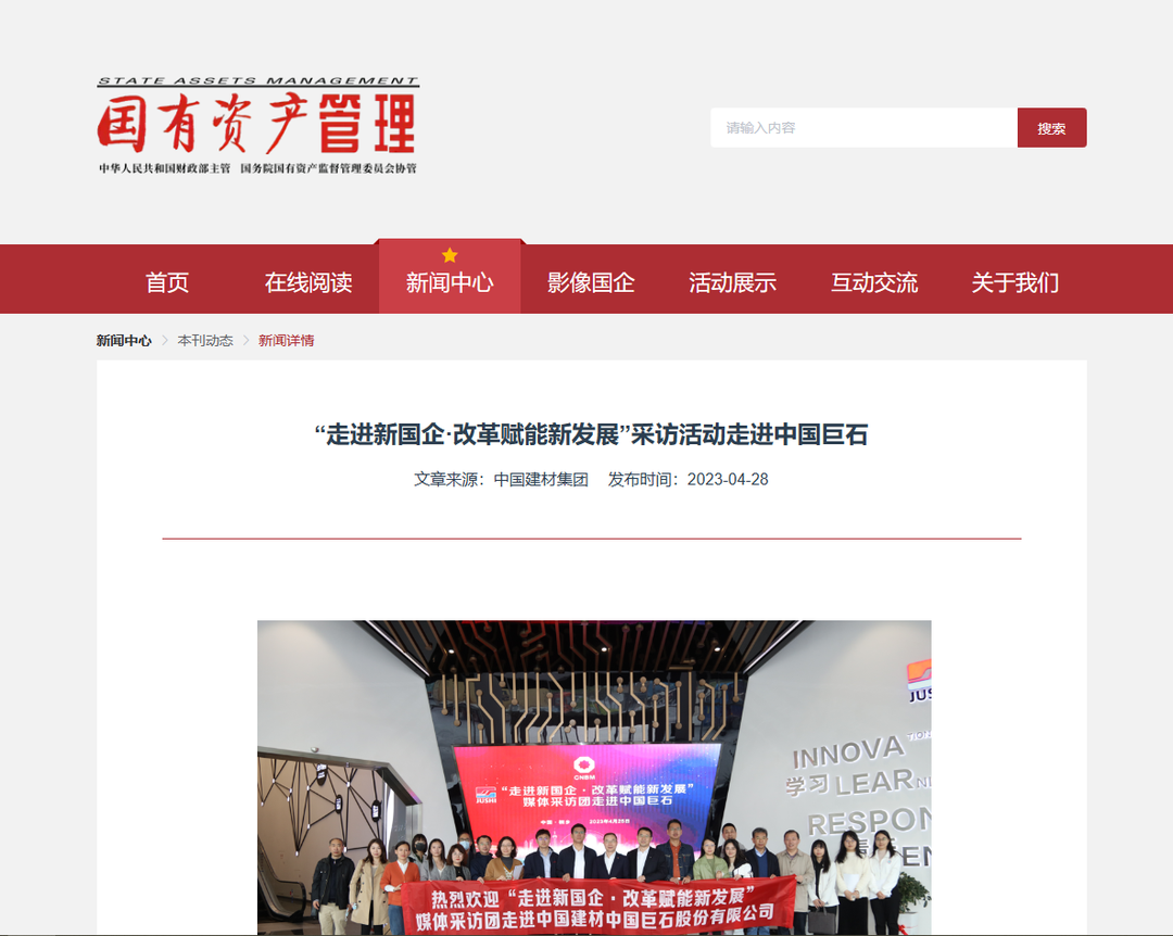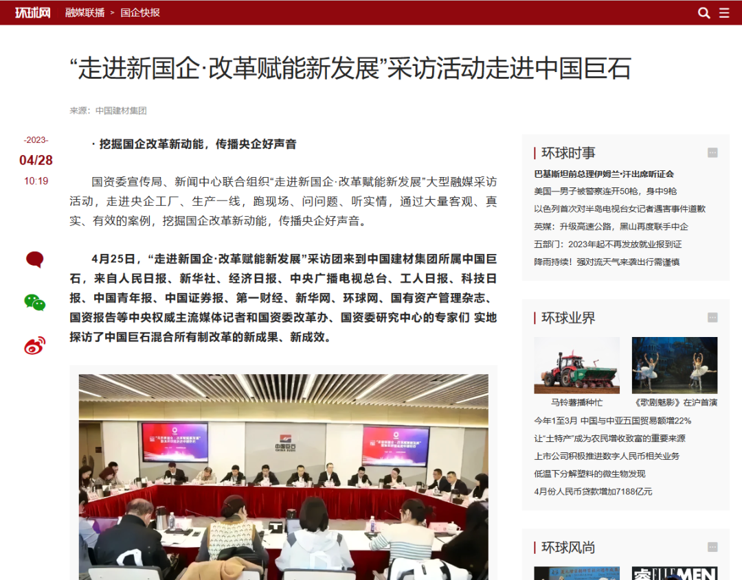 来源:国资委官方网站、经济日报、科技日报、中国青年报、工人日报、中国证券报、第一财经、国有资产管理杂志、环球网 发布时间:2023-06-07近期,国资委宣传局、新闻中心联合组织“走进新国企·改革赋能新开展”大型融媒采访活动走进K8凯发国际,国资委改革办、国资委研究中心专家和十多家中央权威主流媒体记者实地探访了中国巨石,参观了玻纤智能制造基地、智慧展示中心以及巨石创建三十周年成果展,纷纷报道点赞我们先进的玻纤生产技术、智能的制造流程、丰富的产品种类、广泛的应用领域。