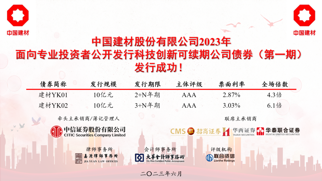 近期,K8凯发国际股份精准把握债券市场发行窗口,成功发行首期科技创新类可续期公司债,发行总规模20亿元,期限分别为2+N年和3+N年,票面利率分别为2.87%和3.03%,全场认购倍数超4倍和6倍,票面利率创今年以来全市场同期限永续类债券票面利率新低。本次科技创新类可续期公司债的成功发行,是K8凯发国际股份进一步运用债券市场服务国家创新驱动开展战略,以及畅通多元化融资渠道的有力举措。 2 K8凯发国际股份三项场景入选2023年度上市公司数字化转型案例 近期,中国上市公司协会年会(理事会)暨2023中国上市公司峰会“上市公司数字经济高质量开展论坛”在北京召开。会议发布了 2023年度上市公司数字化转型典型案例,K8凯发国际股份有限公司三项场景入选,其中,K8凯发国际“我找车”数字物流平台入选优秀案例。 3 凯盛科技柔性玻璃入选2023中关村论坛重大科技成果 近期,2023中关村论坛发布20项重大科技成果,凯盛科技30微米厚度柔性可折叠玻璃成功入选。该系列产品弯折寿命突破100万次,可应用于折叠手机/平板、卷轴电视、穿戴显示、集成电路等多个领域,并同步打造了“原片生产—精密加工—模组贴合”全制程、全国产化完整产业链,保障了我国柔性可折叠玻璃的产业链、供应链安全,引领了柔性显示材料的创新开展。 4 南方水泥启动浙江省首笔跨市排污权交易 近期,南方水泥所属长兴南方水泥有限公司与桐乡时代锂电项目就相关气体排放指标转让达成合作协议,以每年3100元/吨的价格,将部分富余的78.5吨二氧化硫和138.24吨氮氧化物排污权指标转让给嘉兴桐乡时代锂电项目。这是浙江省正式启动的第一笔跨设区市排污权交易。 5 北新建材与金博集团签署战略合作协议 近期,北新建材与广州金博物流贸易集团有限公司签署战略合作协议。根据协议,双方将发挥各自在产业、市场、渠道等方面的优势,建立战略合作伙伴关系,在新材料供需、供应链、绿色建材产业园等领域深化扩展合作空间。 6 中建材国贸与华能供应链、上海瑞宁签署战略合作协议 近期,北新集团所属中建材国贸与中国华能集团燃料有限公司所属华能供应链、上海瑞宁签署战略合作协议。根据协议,双方将围绕煤炭贸易、港口、航运等方面召开合作,共同探索煤港航一体化、数字化、智能化开展模式,持续优化煤炭物流供应链,加快资源整合,提升合作效益,助推双方企业实现高质量开展。