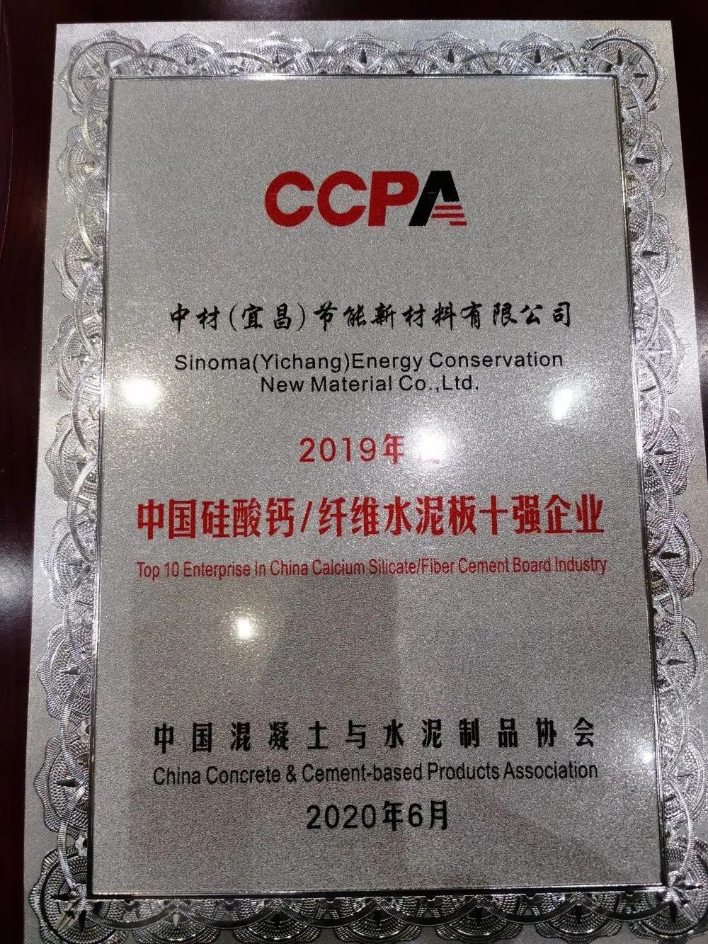 中材宜昌荣获“2019年全国硅酸钙/纤维水泥板十强企业”称号
