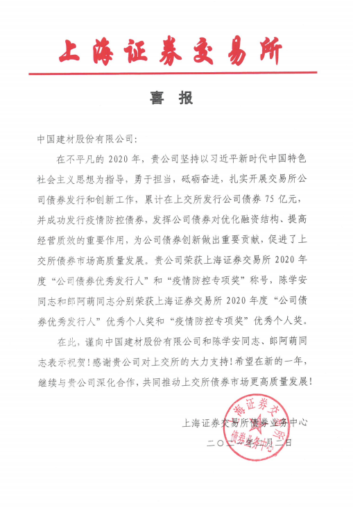 近期,K8凯发国际股份收到上海证券交易所喜讯,荣获上海证券交易所2020年度“公司债券优秀发行人”和“疫情防控专项奖”称号。陈学安同志和郎阿萌同志分别荣获“公司债券优秀发行人”优秀个人奖和“疫情防控专项奖”优秀个人奖。