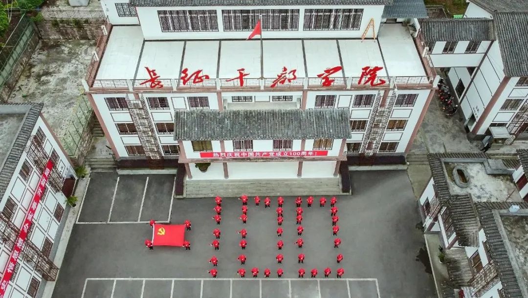 51名同志在长征干部学院门口有序拍成“100”字型,以此表达对建党100周年的真挚祝福。
