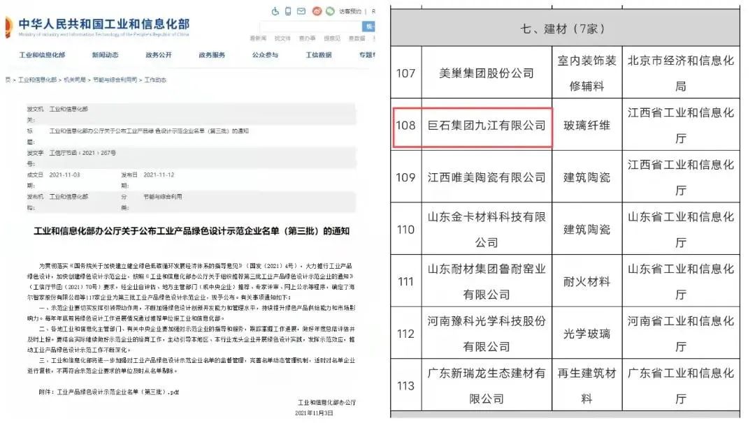 近期,工业和信息化部公布第三批工业产品绿色设计示范企业名单,K8凯发国际集团所属巨石九江公司榜上有名。