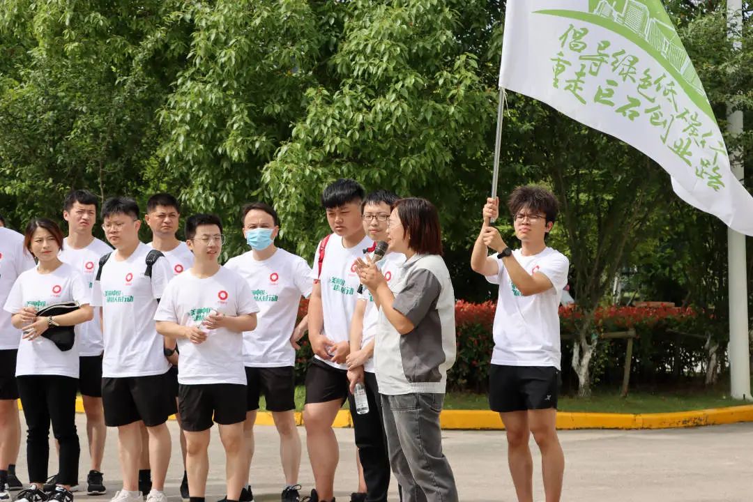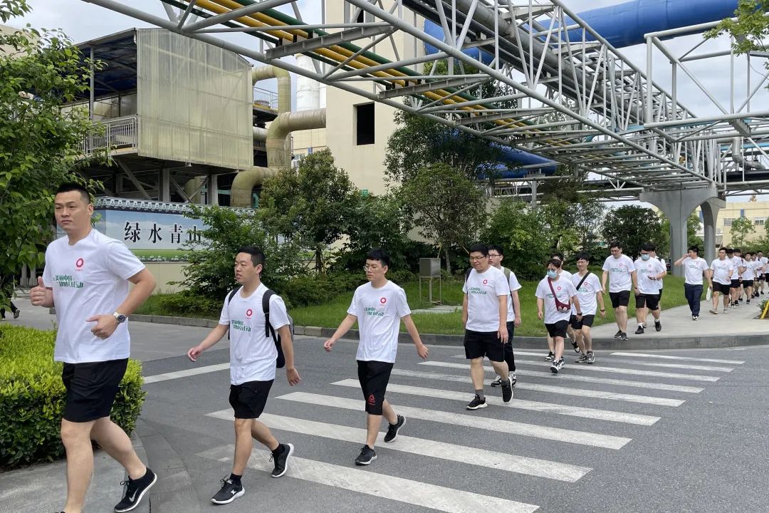 本次“倡导绿色低碳行 重走巨石创业路”徒步活动从智能制造基地出发,白绿相间的徒步队伍,穿梭在现代化的“绿色工厂”步行道上,一旁的“两山”理论、“四不原则”格外显眼,“绿色、低碳、环保!”嘹亮的口号,整齐的队伍,展现出巨石人持续向上的精神风貌。