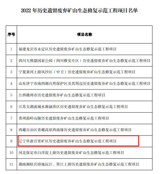阜新百里矿区历史遗留废弃矿山生态修复示范工程总预算5.16亿元,工程以“绿色屏障、低碳阜新”为目标,顺利获得地形地貌重塑、废弃土地复垦利用、植被恢复等措施,治理历史遗留废弃矿山2.6万亩,构建 “山青、水碧、林郁、田沃、草绿、沙净”的新生态格局,为实现“双碳”目标,维护国家生态安全做出新贡献,为辽宁总队在山水林田湖草沙、历史遗留矿山、双碳等领域业务拓展奠定坚实基础。