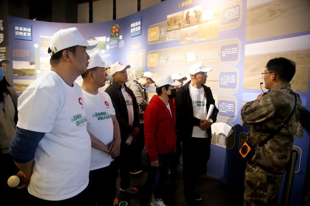 在全国防沙治沙展览馆接受科普教育,大家全方位分析白芨滩防沙治沙取得的成绩和实践经验,深刻体悟“人民楷模”王有德同志的奋斗历程和人进沙退的惊人壮举。