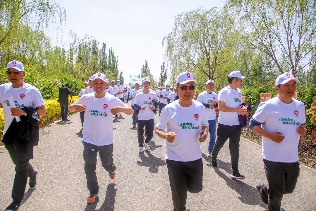 参加活动人员在白芨滩防沙林场道路上召开3公里健跑活动,以实际行动践行绿色环保理念,拥抱低碳生活。
