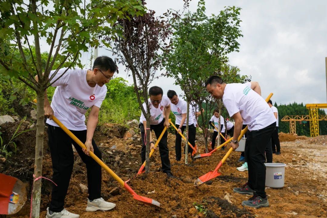在植树现场,大家干劲十足,以饱满的热情共植黔南州州树——枫香树,搬苗提水、挥锹铲土、填树入坑,共建低碳项目,共享"绿色银行",添彩美丽中国。