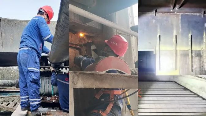 面对今年篦冷机技改后,余热发电系统吨熟料发电量较低的情况,公司立即创建攻关小组,对影响因素逐项排查并改善,对循环水池冷却风机叶片角度进行调整,对玻璃钢冷却塔漏风点进行封堵,对凝汽器、前置冷却器等进行化学高压清洗,对内外密封进行优化,把篦冷机旁路挡风墙向篦冷机尾部移位,并将挡风墙异形设计(比计划中的改管道减少投资70万元)。顺利获得一系列技改项目实施,吨熟料发电量提高了3kWh/t,年收益可达120万元。